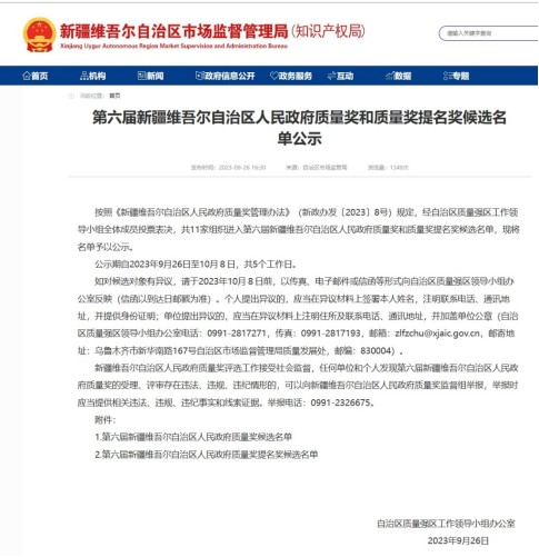 新疆维吾尔自治区人民政府质量奖(以下简称“新疆质量奖”)设立于2013年,是自治区人民政府设立的最高质量荣誉奖项,主要授予在我区依法设立、在创建先进质量管理模式、推广先进质量理念、推行科学质量管理方法等方面成效突出,具有显著的示范带动作用,对促进我区经济社会发展作出突出贡献的组织。按照今年修订的《新疆维吾尔自治区人民政府质量奖管理办法》(以下简称《管理办法》)有关规定,新疆质量奖设质量奖(正奖)、质量奖提名奖两个档次,评选周期为2年。质量奖名额每届不超过5个组织,质量奖提名奖名额每届不超过10个组织。评审工作按照通知、申报、审核推荐、资格审查、材料评审、陈述答辩、现场评审、审议、审定九个程序进行。