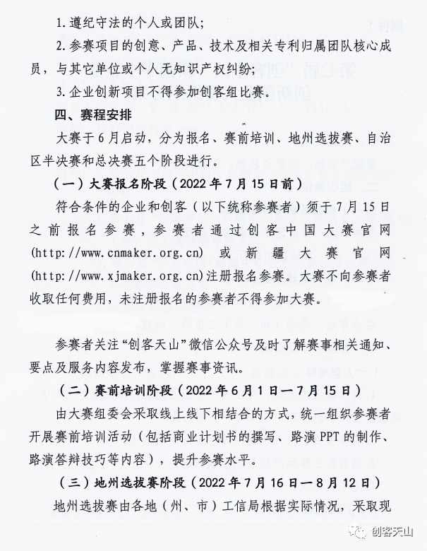 大赛报名截止时间为2022年7月15日。参赛者关注“创客天山”微信公众号及时了解赛事相关通知、要点及服务内容发布,掌握赛事资讯。参赛者同一项目或相似项目不可重复报名参加全国大赛组委会组织的专题赛、境外区域赛,对于重复参赛或剽窃、侵夺他人创新成果,以及用其他不正当手段骗取奖项的参赛者,一经发现取消参赛资格。