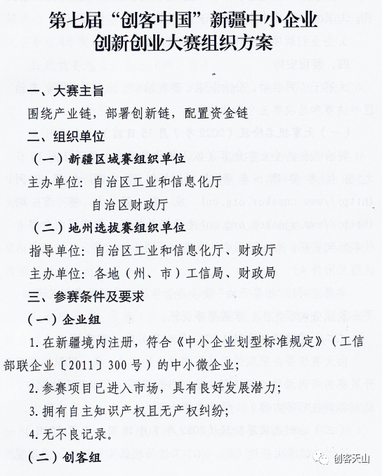 为深入贯彻落实党中央、国务院决策部署,进一步提升中小企业创新能力和专业化水平,推动中小企业高质量发展,根据工业和信息化部、财政部《关于举办第七届“创客中国”中小企业创新创业大赛的通知》(工信部联企业函〔2022〕108号),自治区工业和信息化厅、财政厅将共同举办第七届“创客中国”新疆中小企业创新创业大赛,现就有关事项通知如下: