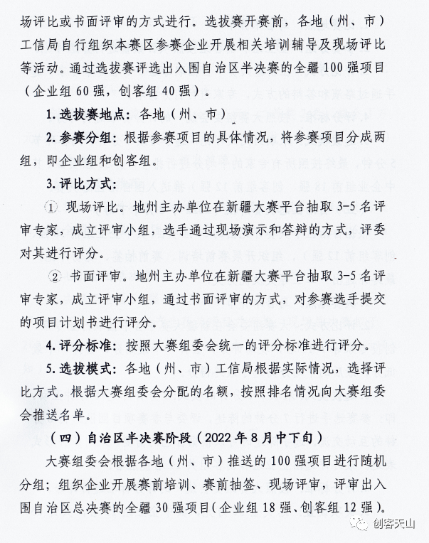(三)各地州选拔赛均须于8月12日前完赛,并将推送入围自治区半决赛的优质项目报送至大赛组委会。