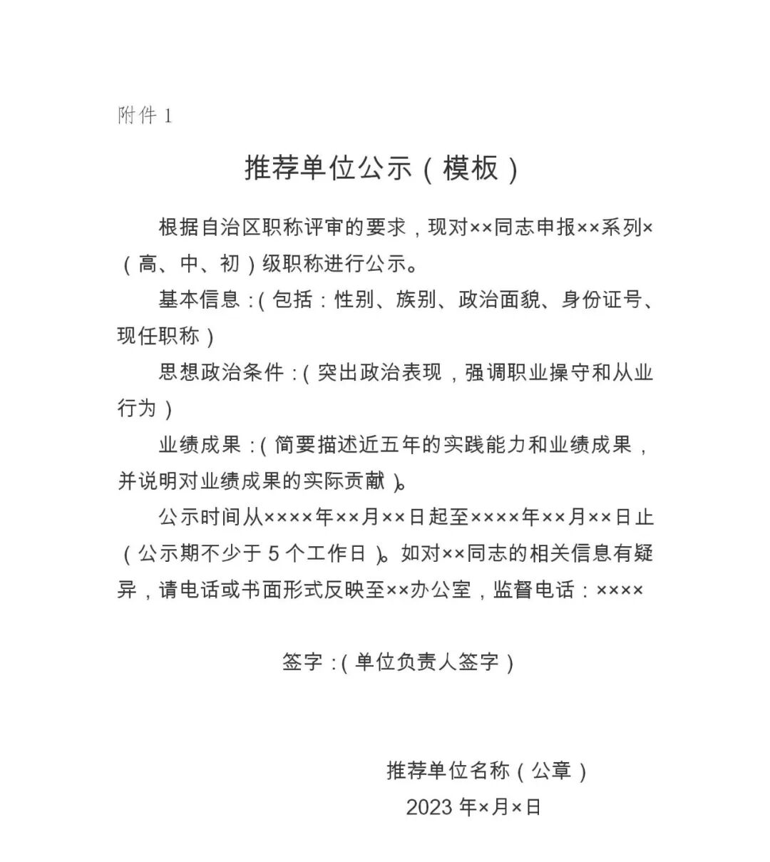 来源:新疆维吾尔自治区科学技术厅各地、州、市人力资源和社会保障局、科技局,自治区各委、办、厅、局、人民团体、大专院校、科研院所、大中型企业人事(职称)部门、中央驻疆单位人事(职称)部门:按照自治区职称工作统一安排,现将2023年自治区自然科学研究、实验技术系列职称评审工作有关事项通知如下:材料审核时间:2023年9月15日-10月20日。自然科学研究系列(研究员、副研究员、助理研究员、研究实习员)、实验技术系列(正高级实验师、高级实验师、实验师、助理实验师)。严格按照《新疆维吾尔自治区自然科学研究系列职称评审条件(试行)》(新人社发〔2022〕23号)、《新疆维吾尔自治区实验技术系列职称评审条件(试行)》(新人社发〔2022〕38号)等条件施行。申报职称人员登录“新疆专业技术人员管理平台(网址:http://www.xjzcsq.com,以下简称“平台”),按要求上传职称评审资料。申报流程和具体要求,请查阅平台内的“操作指南”。在上传职称评审资料时,所填各项栏目必须上传佐证材料及相关证明,漏传、错传、不传的一律视为没有相关资料。申报职称人员所在工作单位要严格按照自然科学研究、实验技术系列职称评审条件审核申报材料,对其真实性、完整性和时效性负责,并将审核通过人员的申报材料,逐级提交至自治区自然科学研究、实验技术系列职称评审委员会。我们将对申报材料进行严格审核,对申报材料不完善的予以退回,经修改后再上报,且上报次数不得超过3次。3.现任职称资格在疆内取得的,上传“任职资格文件”或“职称证书”或“专业技术职务任职资格评审表”;现任职称资格在其他省区市取得的,上传“任职资格文件”、“职称证书”和“专业技术职务任职资格评审表”。有机关调动(含分流、转移)到各类企事业单位从事专业技术工作的人员,此栏目需上传相关印证材料。4.专业科目提供2021-2023年度培训合格证书,公需科目提供2019-2023年度培训合格证书。5.取得现任职称资格以来,反映本人学识水平、业务能力、工作业绩的相关印证材料。6.取得现任职称资格以来的个人业务工作总结(重点说明工作业绩和学术水平情况)。7.近三年年度考核登记表或《专业技术人员任职期满考核表》(正、反面)。8.对本人申报材料的真实性负责,填写并上传本人签字的个人承诺书。(二)推荐单位。申报人所在工作单位对申报材料进行审核,并在单位内部进行公示,公示期不少于5个工作日,对公示无异议的,填写审核意见“本单位已对提供的申报材料逐一审核,真实、完整、有效,同意推荐”,并上传单位公示证明及公示结果。(三)主管单位。主管单位人事(职称)部门要认真审核申报人员材料,对审核情况填写明确意见,并按要求上传加盖公章的推荐意见。(四)中央驻疆单位、外省驻疆企业和军队的专业技术人员需要参加评审的,由省部级人事(职称)部门或军区政治部开具委托评审函,经自治区专业技术人员职称办公室审核同意后,即可申报,并上传委托评审函。(五)援派期一年以上,且正在援疆期间的专业技术人员,申报材料经派出单位(原所在单位)组织人事部门审核同意,即可申报,并上传审核同意的证明材料。1.全面实行岗位管理的事业单位,一般应在岗位结构比例内,推荐符合条件的专业技术人员参加职称评审。2.职称评审采取“盲评”方式,申报人须在系统内将所有附件材料中出现的本人姓名及工作单位进行“遮盖”处理,凡“遮盖”不符合要求的一律不予受理。3.高技能人才参加专业技术人员职称评审,按照自治区人力资源和社会保障厅印发的《关于进一步做好自治区高技能人才和专业技术人才职业发展贯通工作的通知》(新人社发〔2021〕26号)执行。4.参加自治区“访惠聚”驻村等工作的专业技术人员,按照《关于对参加“访民情惠民生聚民心”驻村工作的专业技术人员予以职称政策倾斜的通知》(新人社函〔2017〕175号)执行。5.请各单位及时组织本系统、本单位人员开展职称申报工作,认真审核职称评审材料并在规定的期限内及时提交。材料不得弄虚作假,一经发现,将按照《事业单位工作人员处分暂行规定》(人社部令第18号)《职称评审管理暂行规定》(人社部令第40号)及有关规定严肃查处,三年内不得申报相应职称评审。自治区自然科学研究、实验技术系列职称评审工作咨询电话:0991-3832580自治区科技厅人事处联系电话:0991-3820090平台技术服务联系电话:0991—3193615、3193501