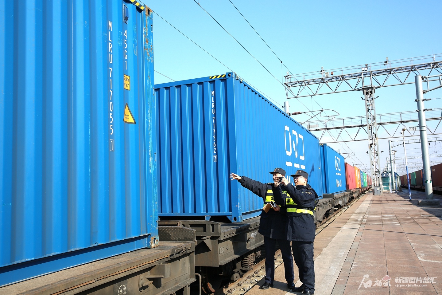 阿拉山口海关关员监管入境中欧班列(3月11日摄)。(摄影:石钰涵)