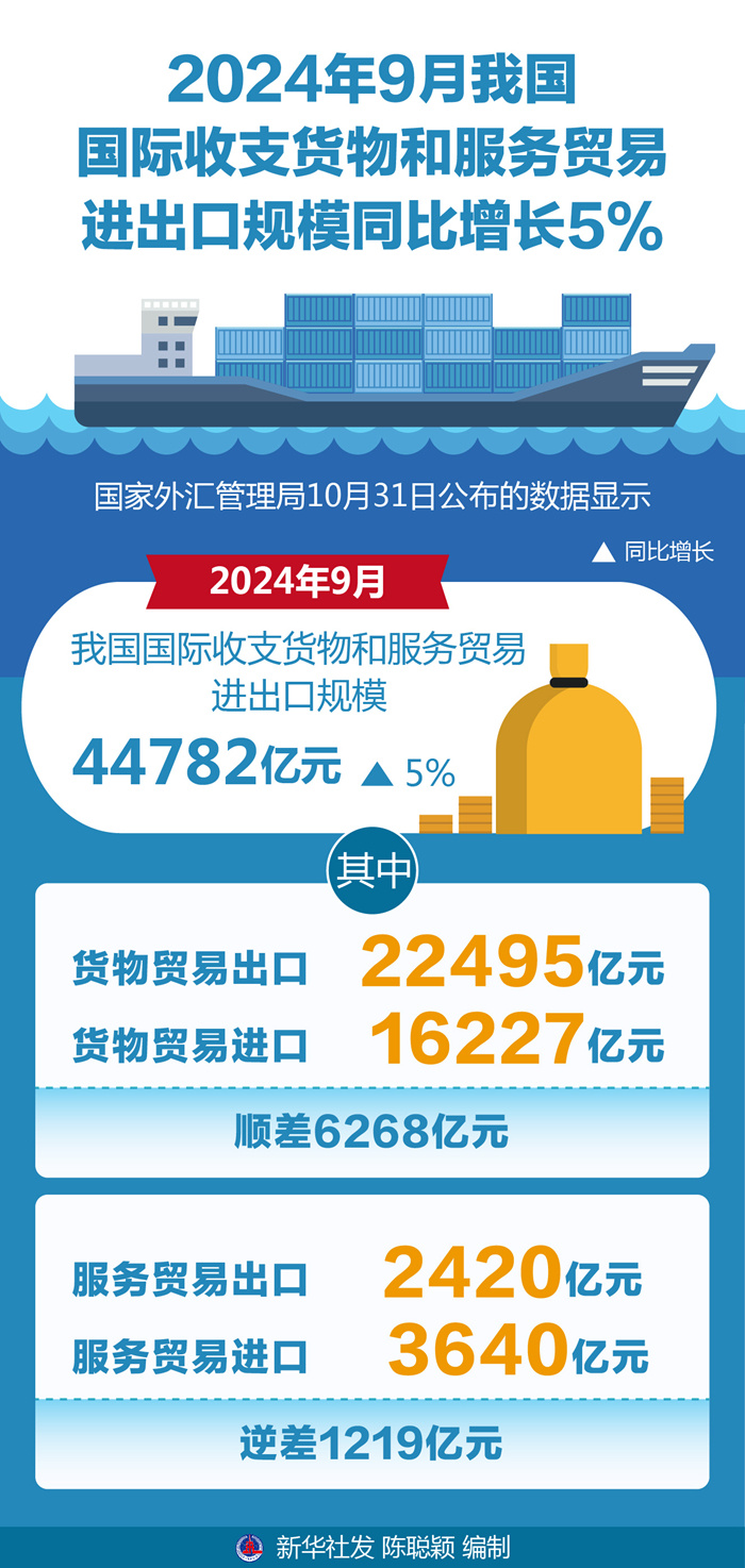 新华社北京10月31日电 国家外汇管理局31日公布的数据显示,2024年9月,我国国际收支货物和服务贸易进出口规模44782亿元,同比增长5%。
