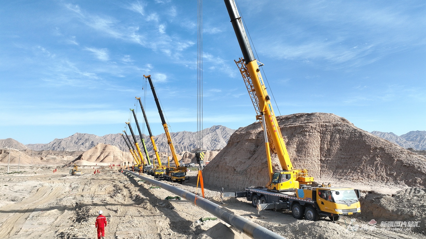 气化南疆天然气管道工程首段管道克轮复线2号阀室至英买力管道建设现场,吊机挥舞长臂,将一条条“气龙”铺设向前。(摄影:唐浩)