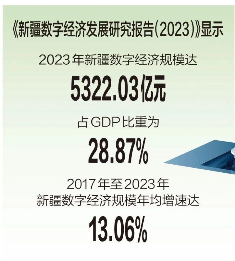 《新疆数字经济发展研究报告(2023)》显示,2023年新疆数字经济规模达5322.03亿元,占GDP比重为28.87%。